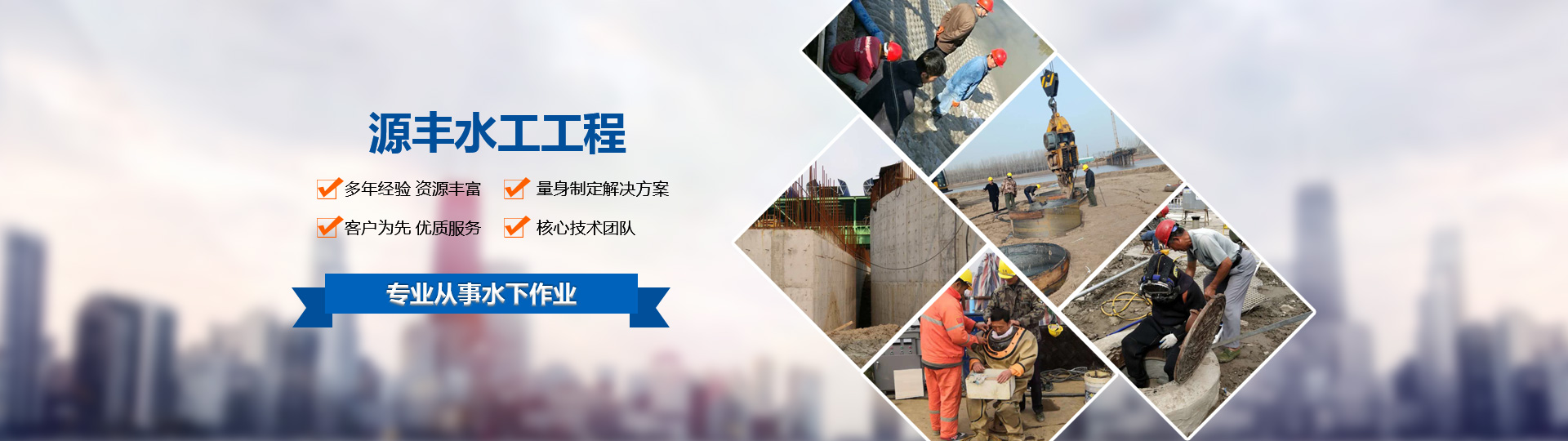 ——專業(yè)從事水下作業(yè)的股份制企業(yè)他們也在搜:堵漏施工 / 鋼板樁施工 / 模袋混凝土施工 / 水下施工 / 沉井施工 / 過(guò)河管道施工 /